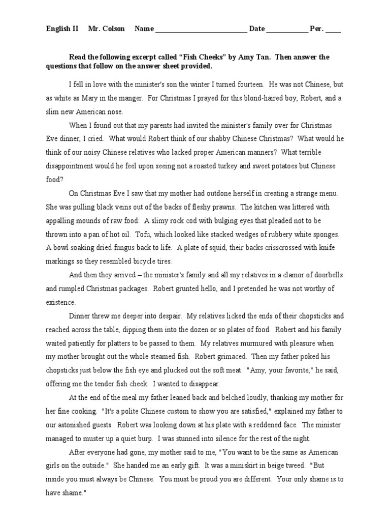 Whereas, for me at least, the answers on english tests. After reading fish cheeks, help your students dive deeper into . Answer the questions that follow. View fish cheeks questions.pdf from english 11 at grandview high school. Amy tan uses epiphany to argue that you should accept yourself in "fish cheeks".